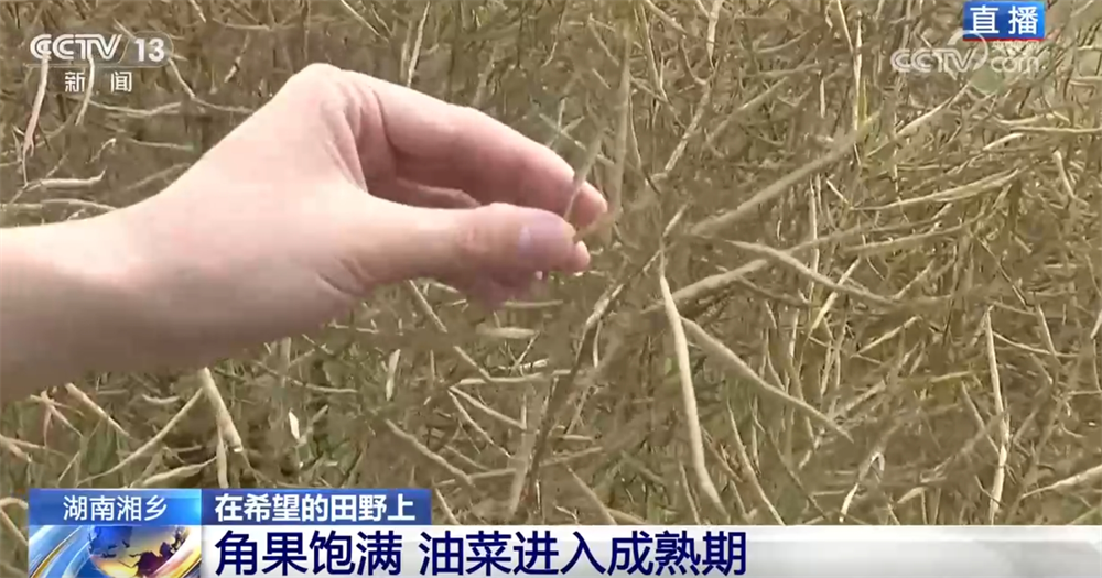 眼下,全国粮食出产进入了环节期。颠末持续几天的降雨,湖南多地已雨过晴和,种粮户们正放松做好春耕、春督工做。湘潭湘乡市是全国粮食出产大县,粮食种植面积常年不变正在100万亩以上。本地不少农户采用“稻油轮做”的模式,眼下恰是收割油菜籽、播种一季稻的农忙时节。细致环境,顿时连线正正在现场的总台记者葛才逸。记者来到了湘潭湘乡市泉塘镇双江村,油菜现正在长得怎样样了?油菜的顶端曾经呈金,角果很丰满,我们日常平凡常说的油菜籽就藏正在金的角果里,这申明现正在油菜曾经进入成熟期了。