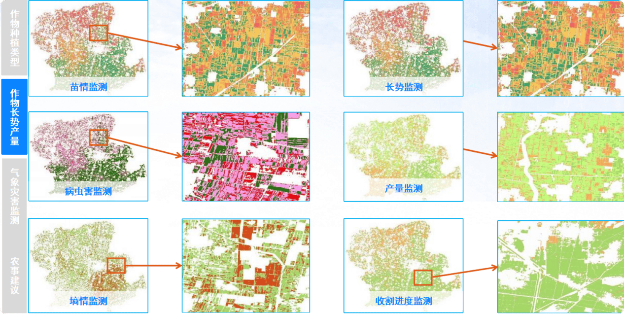 2。 做物长势产量借帮遥感监测手艺,能够及时监测做物的长势环境。通过对植被指数、土壤湿度等目标的阐发,及时发觉做物发展过程中的问题,缺水、缺肥等,为精准施肥、灌溉和病虫害防治供给决策支撑,从而提高做物产量和质量。