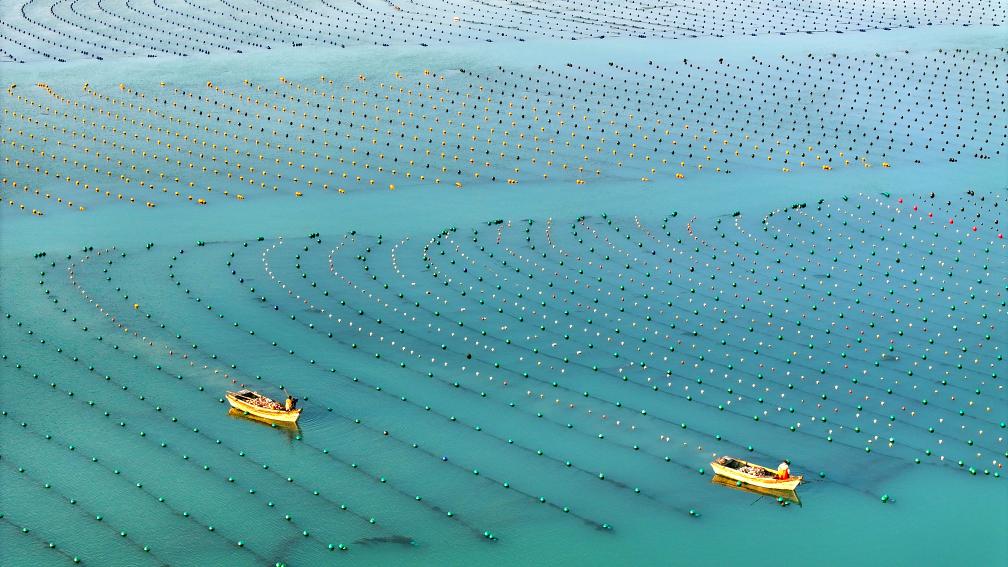 2月11日,正在荣成市爱伦湾海洋牧场海带养殖区,养殖工人驾驶渔船出海功课(无人机照片)。发(礼摄)。